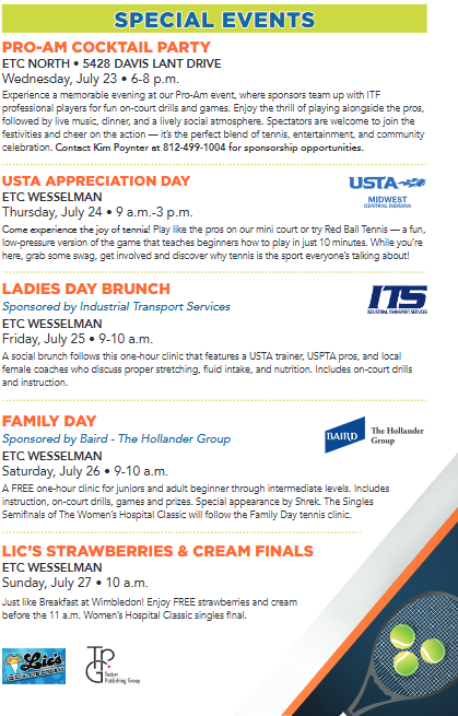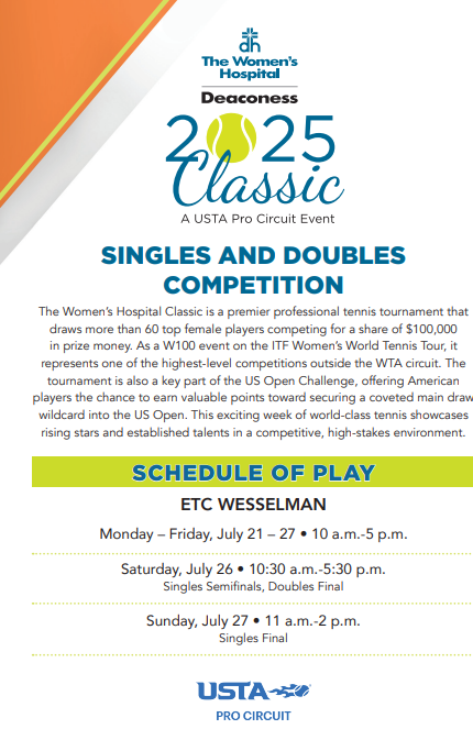 The Women’s Hospital Classic Professional Tennis Tournament is set to make a thrilling return to Evansville this summer, now upgraded to an ITF W100 event—the highest-level USTA Pro Circuit event offered outside of the WTA Tour! The tournament brings with it a $100,000 prize purse and a higher level of competition than ever before. The tournament will take place July 21–27, 2025, at the Wesselman Park Tennis Center.